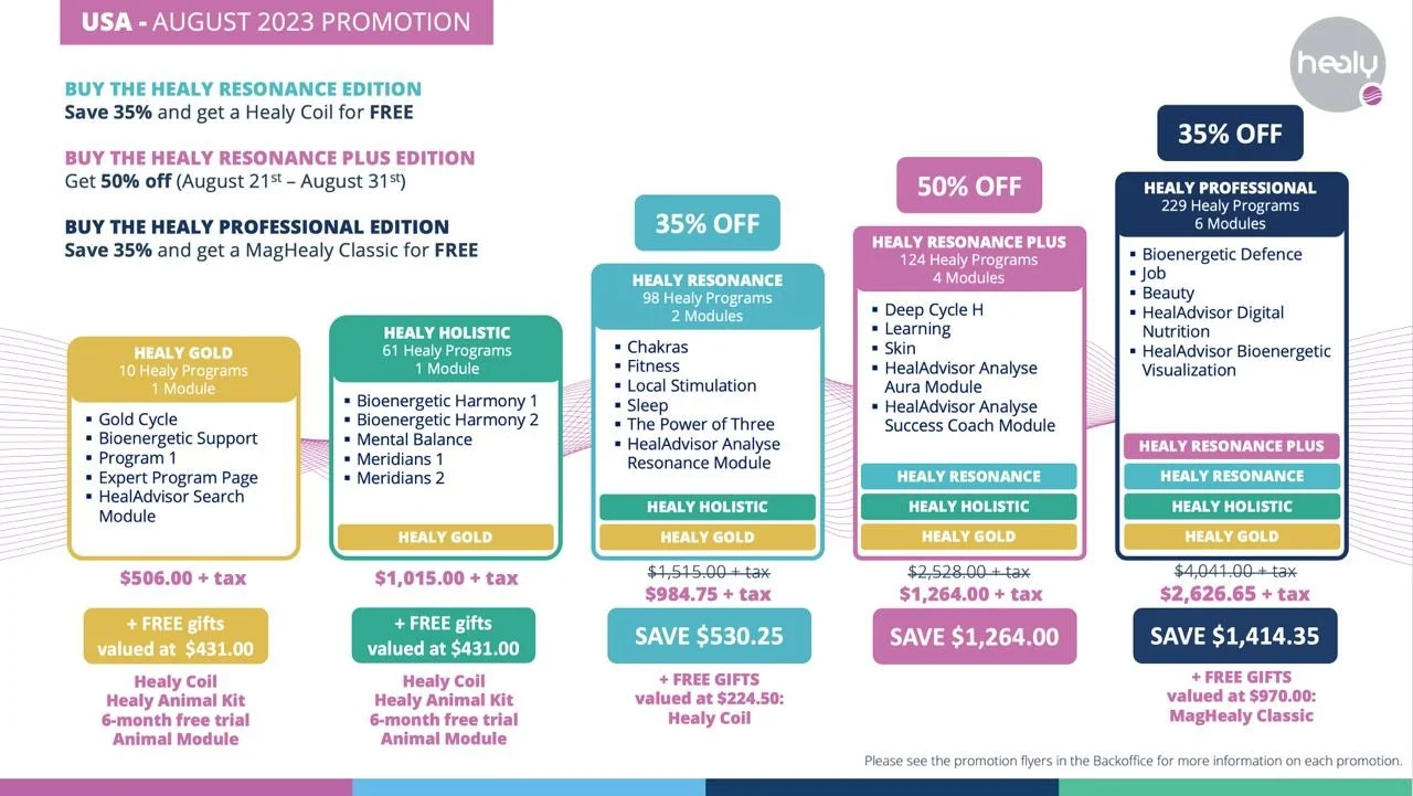 The promotion consists of: a. Receive the Soul Cycle Program Group as a gift with the purchase of a Healy Resonance Edition.b. Receive an additional Healy Coil, and the Soul Cycle Program Group with the purchase of a Healy Resonance Plus Edition.c. Receive an additional Healy Coil, and the Soul Cycle Program Group with the purchase of Healy Professional Edition.