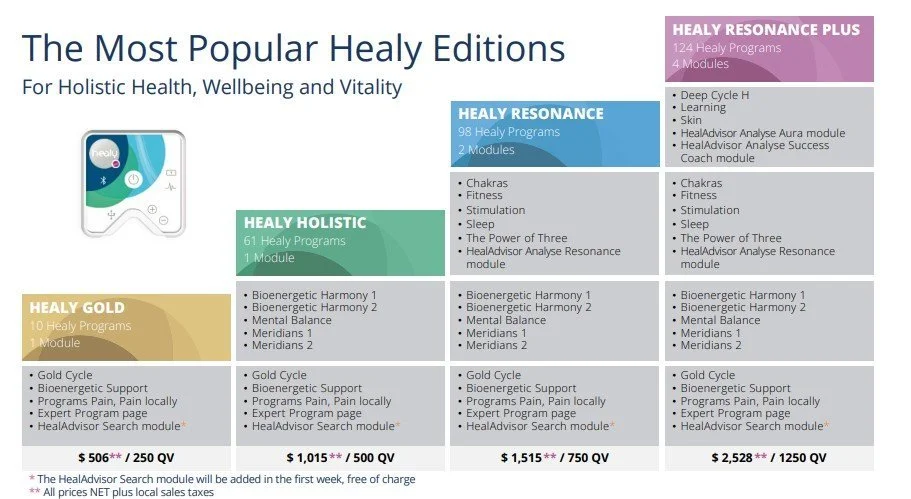 The allocated member volume will be discounted according to the price and the Fast Start Cash Bonus will be calculated according to the table below:Edition Fast Start Cash QV - Healy Resonance Edition 50€* 450 - Healy Resonance Plus Edition 100€* 750 - Healy Professional Edition 100€* 1,200 - Soul Cycle Program Group 0€ 0 - Healy Coil 0€ 0