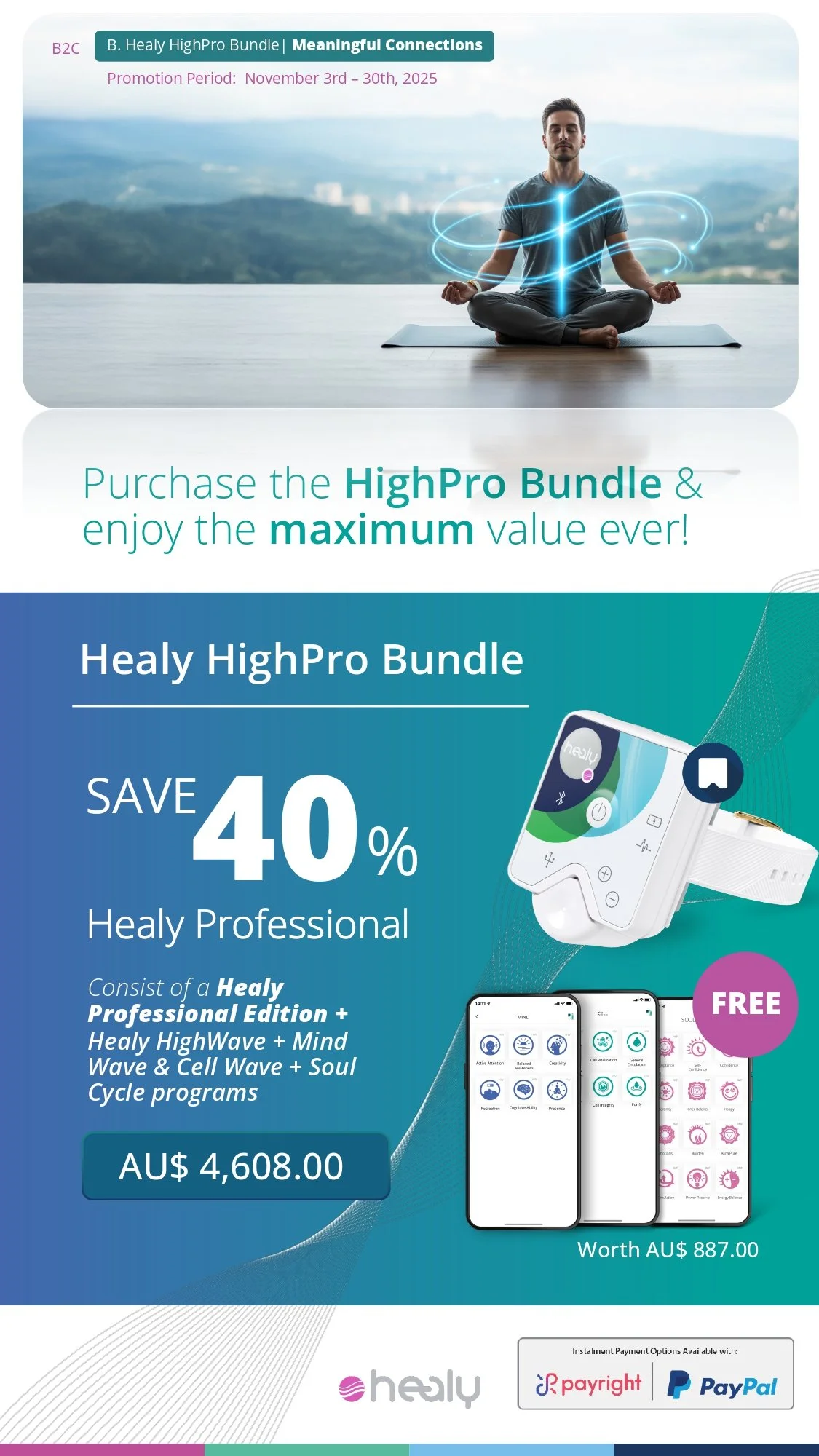 40% Off Healy Professional Combo: Buy a Healy Professional with a Healy HighWave with 40% off and get a free Cell Wave, Mind Wave and Healy Soul Cycle programs.