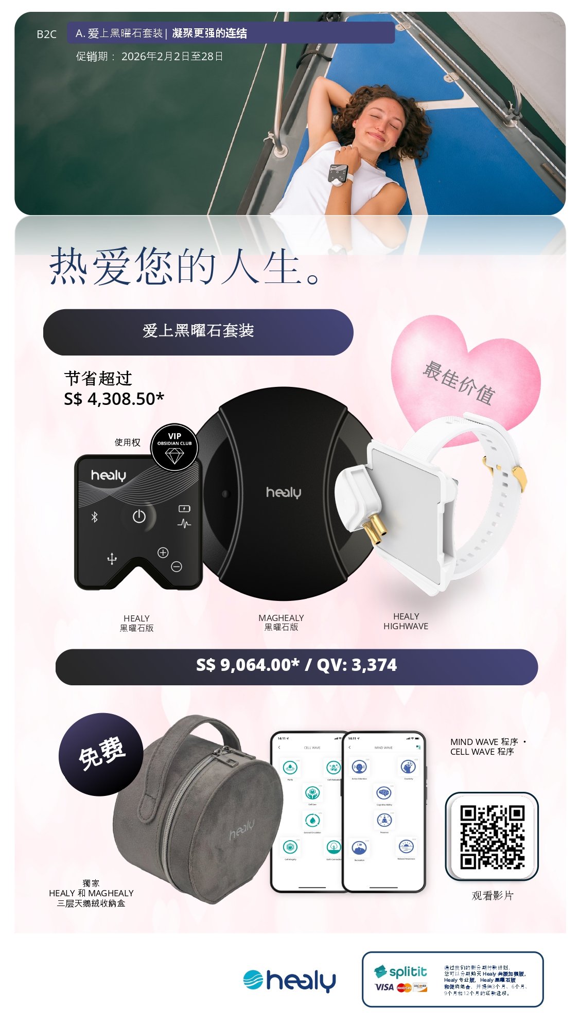 购买 Healy Obsidian、MagHealy Obsidian 和 Healy HighWave,即可享受特价优惠。您还将获赠 Healy Cell Wave、Mind Wave 以及一个特制旅行收纳盒。