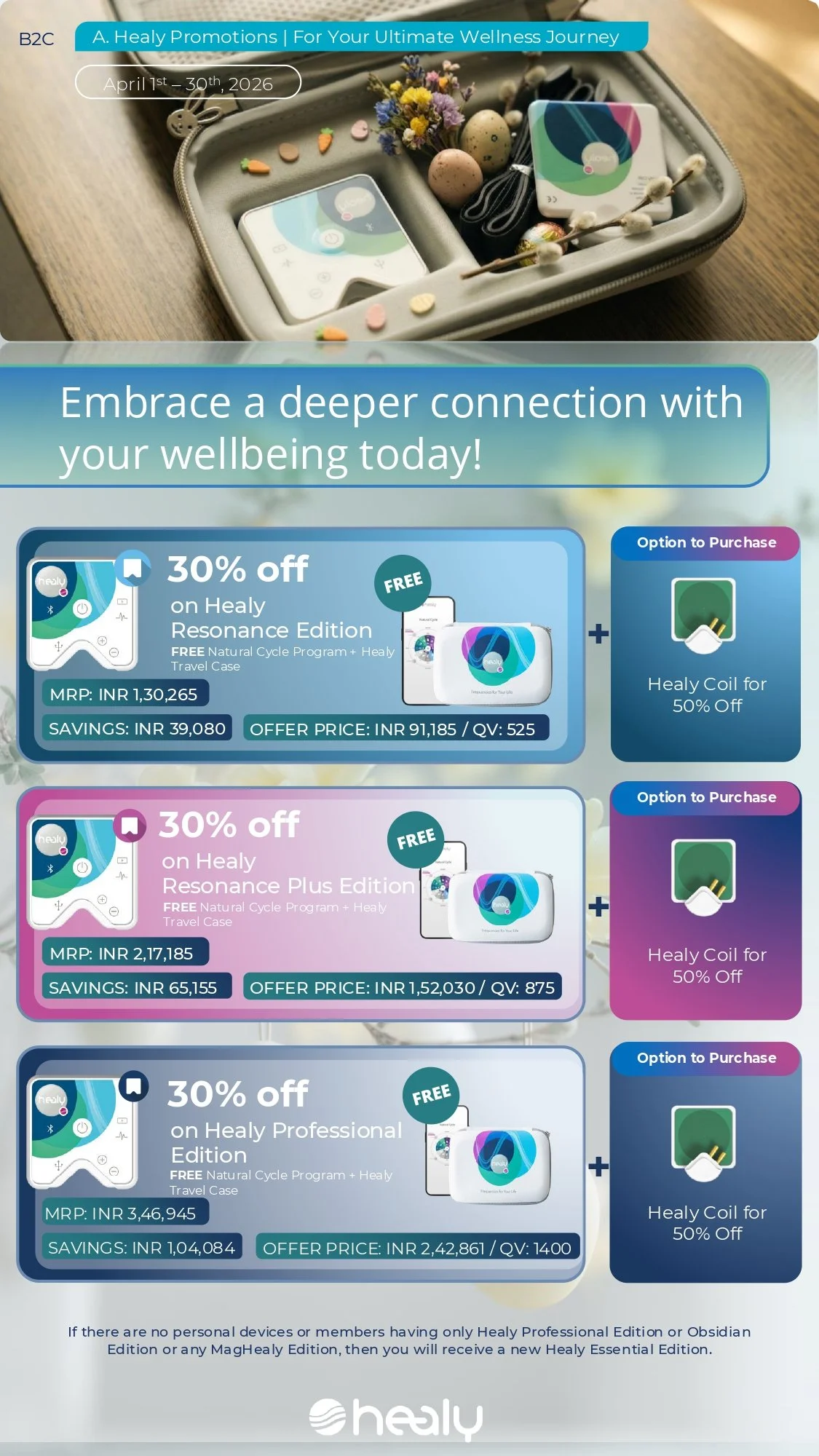 April 2024 brings an extraordinary opportunity for wellness enthusiasts in India to embrace cutting-edge health technology with Healy's exclusive discounts and offers. From the game-changing MagHealy Professional bundle to significant savings across select Healy editions, these promotions are designed to make advanced wellness accessible to more individuals. Whether you're looking to enhance your physical, emotional, or mental well-being, Healy India's April promotions offer unparalleled value. Don't miss out on the chance to transform your health journey with Healy – where technology meets wellness at the best prices in India