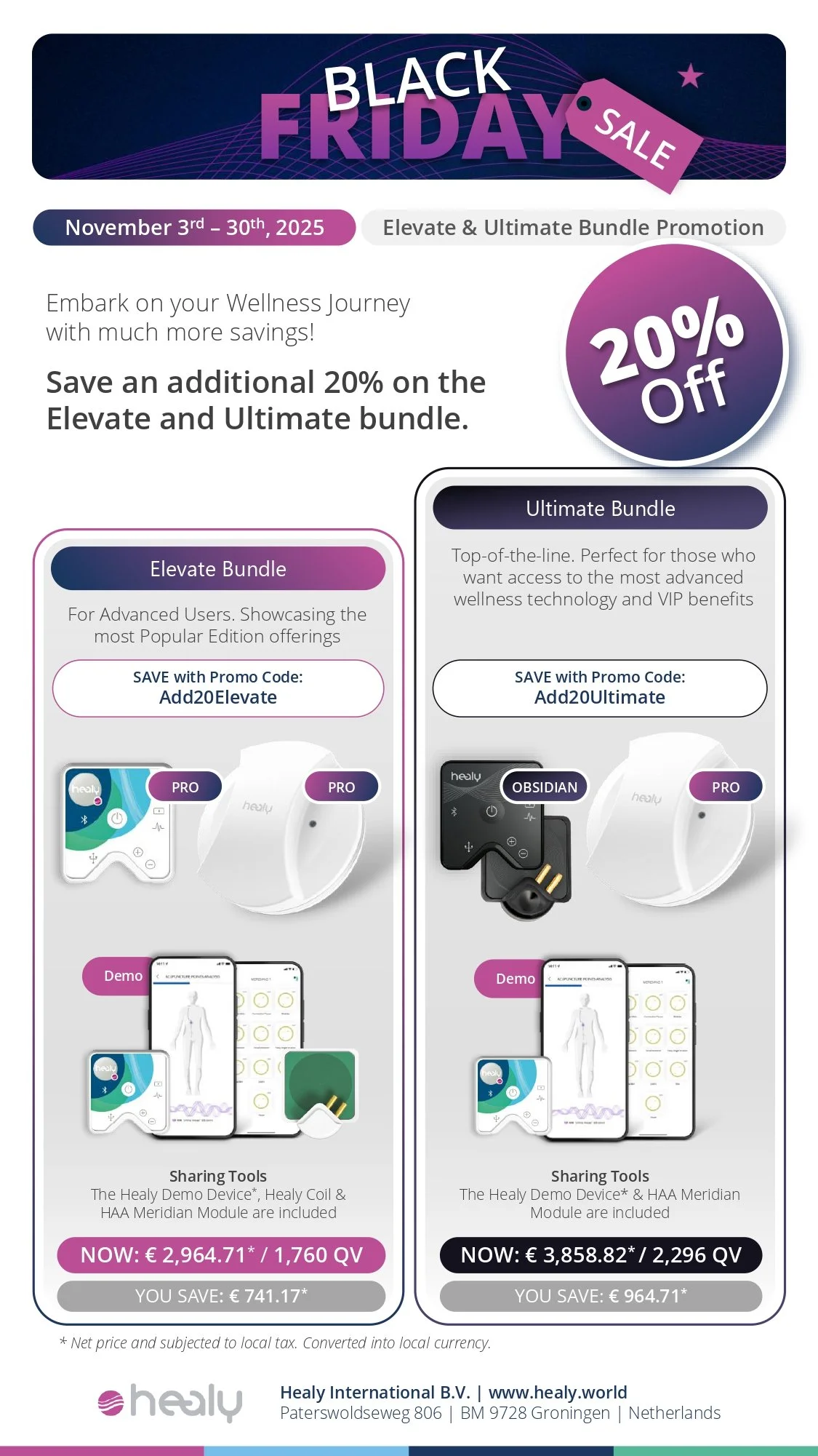 Buy the Healy Pro together with the new Healy HighWave and get the Healy Cell Wave, Mind Wave and Soul Cycle free. Free gifts worth 499 Euros