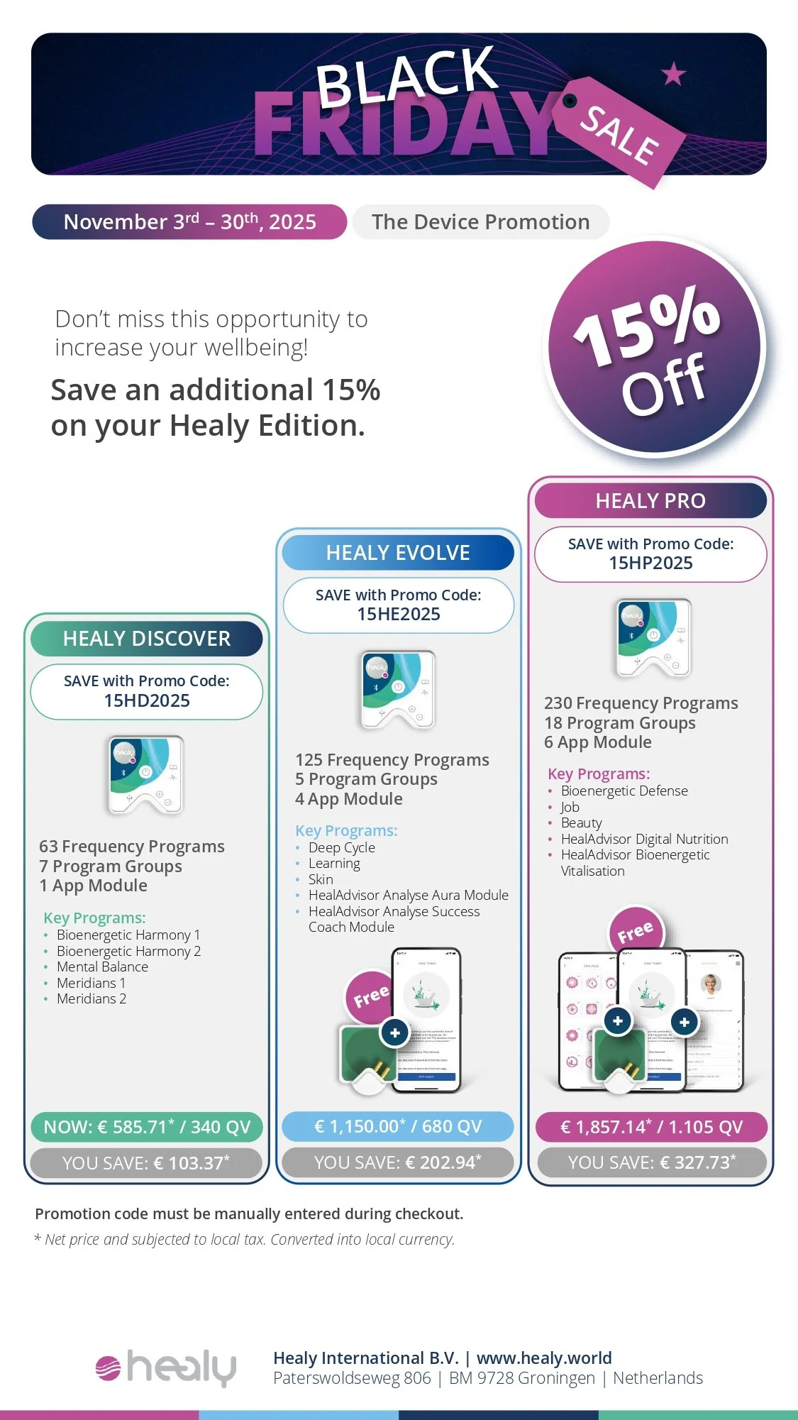 Buy a Healy Discover, Healy Evolve or Healy Pro and save 15% in our Black Friday Sale.