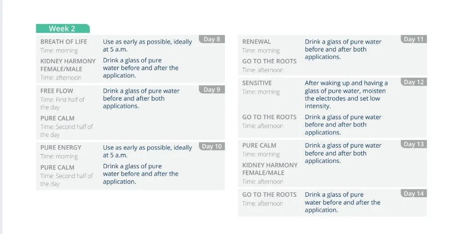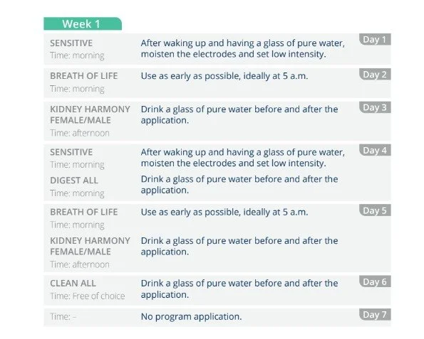 Important: After finishing the 2-, 4- or 6-weeks cycle, please rest for at least three whole days and do not use any kind of frequency application during this period.