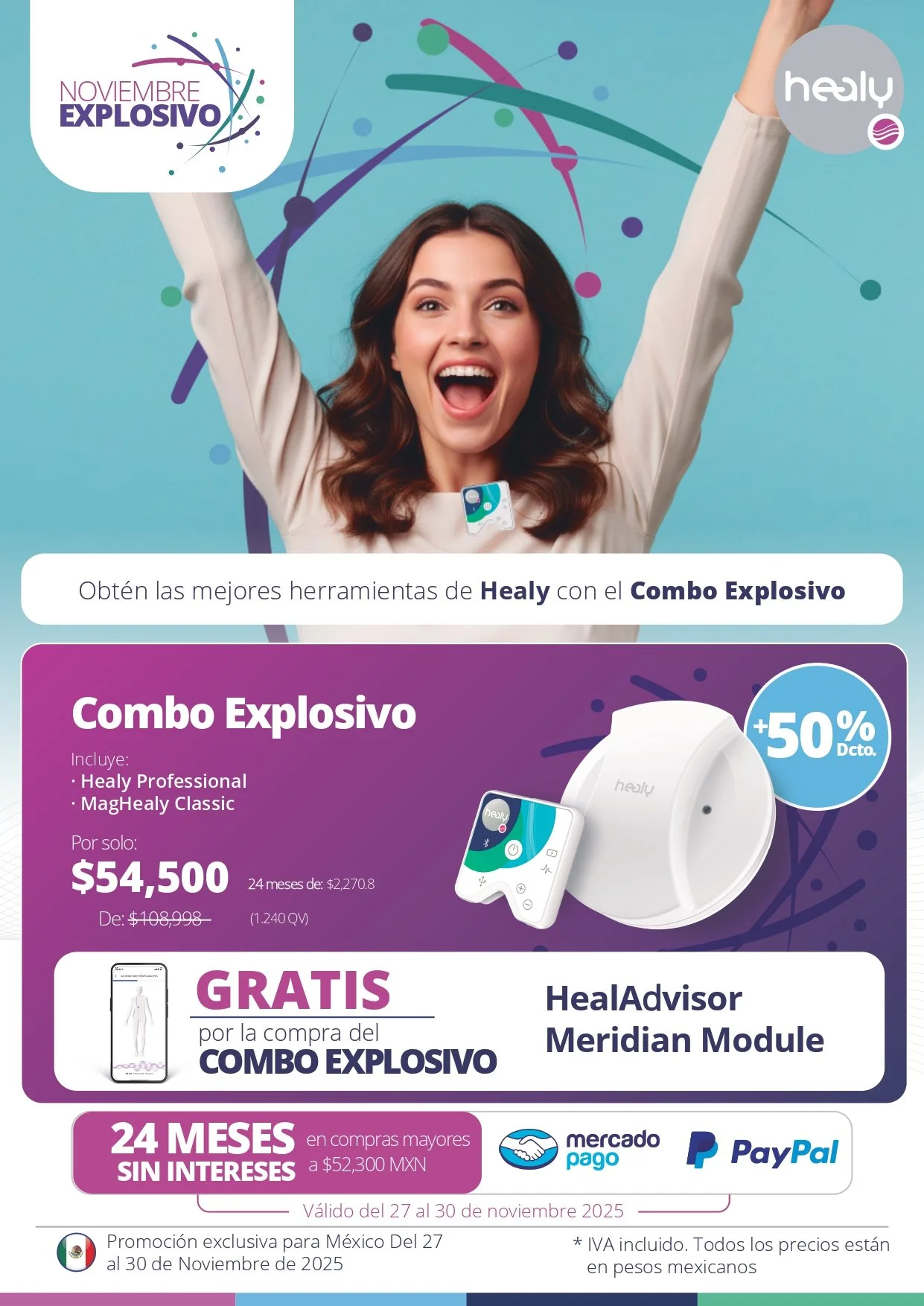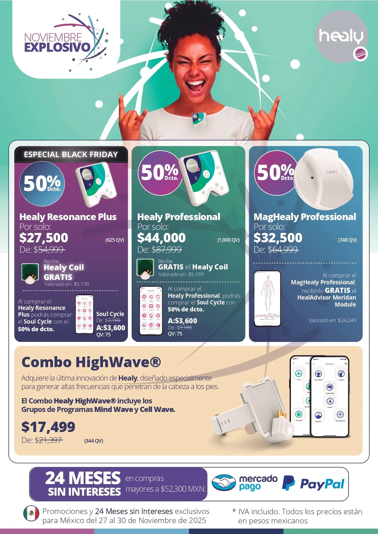 ¡Es hora de tener las mejores ediciones de Healy y elevar tus frecuencias! Healy World ha lanzado su evento de Noviembre Explosivo con descuentos increíbles y regalos en sus dispositivos de frecuencia. Todos los precios están en pesos mexicanos e incluyen IVA.